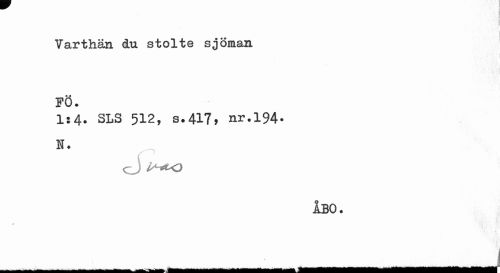 //// '• ii //// Varthän du stolte sjöman FÖ. //// 1:4. SLS 512, S.417» nr.194. N. //// / //// cJ ts~*0 //// ÅBO. ////