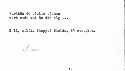 //// I //// Varthän du stolte sjöman vart står väl än din håg ?•? //// B 11, s#124, Skeppet Skulda, 15 str.fkom. //// ¦ i //// iJ^dLsO //// i //// I //// RA. ////