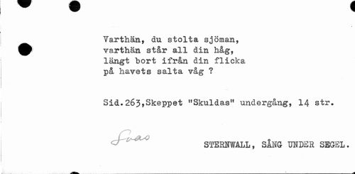 //// Varthän, du stolta sjöman, ^^ varthän står all din håg, //// längt bort ifrån din flicka på havets salta våg ? //// Sid.263,Skeppet "Skuldas" undergång, 14 str. //// STERNWÅLL, SÅNG UNDER SEGEL. ////