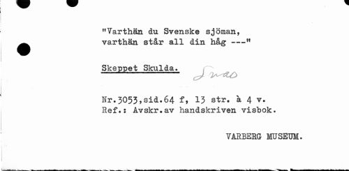 //// "Varthän du Svenske sjöman, ^^ varthän står all din håg---H //// Skeppet Skulda. //// —^- J //// Nr.3055,sid.64 f, 13 str. a 4 v. //// Ref.: Avskr.av handskriven visbok. //// VARBERG MUSEUM. ////