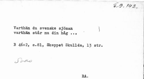 //// Varthän du svenske sjöman \ //// varthän står nu din håg •.« //// B 46:2, s.81, Skeppet Skullda, 1J str. //// ! //// RA. ////