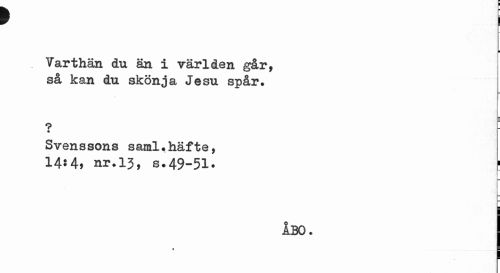 //// 9 I //// L P //// Varthän du än i världen går, så kan du skönja Jesu spår. //// 9 - //// ? //// Svenssons saral.häfte, //// 1454, nr.13, s.49-51» f //// r //// 1 //// I //// ÅBO. I //// ¦ ////
