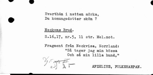 //// Hvarthän i natten mörka, ^^ Du konungsdotter skön ? //// Neekens Brud* //// S.l6,17, nr.5, 11 str. Mel.not. //// Fragment från Neckvisa, Norrland: //// "Så tager jag min bössa Och så min lilla hund," //// % FxfrjzE* //// ' fj§ % ' AFZELIIIS, FOLKSHARPÅN. //// w ////