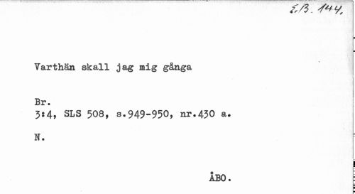 //// j . v y, //// ¦ //// N //// Varthän skall jag mig gånga Br. //// 3$4, SLS 508, s.949-950, nr.430 a. N. //// I ¦ //// ÅBO. //// ¦ //// i ////