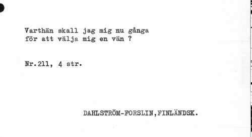 //// f //// Varthän skall jag mig nu gånga för att välja mig en vän ? //// Nr.211, 4 str. //// I //// i //// DAHLSTRÖM-FORSLIN,FIHLÄNDSK. j //// i ¦ ////