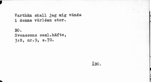 //// v //// Varthän skall jag mig vända i denna världen stor. //// BO. //// Svenssons saml.häfte, //// 3:8, nr.9, s.70. //// ÅBO. //// i //// i— ////