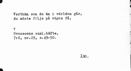 //// i //// Varthän som du än i världen går, du måste följa på vägen få, //// ... . ..i • j //// 9 ? //// Svenssons saml.häfte, E //// 7:6, nr.29, s.49-50. //// B //// ÅBO. //// k ////