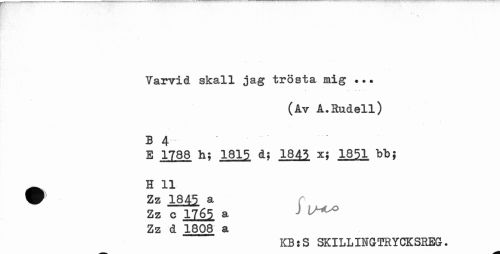 //// 1 //// Varvid skall jag trösta mig ... //// (Av A.Rudell) //// B 4 //// E 1788 h; 1815 d; 1843 xj 1851 bb; //// _ H 11 //// W Zz 1845 a //// Zz c 1765 a //// Zz d 1808 a //// QVTT.T.T'WfiTRVr!TrRT?'Ra. ////