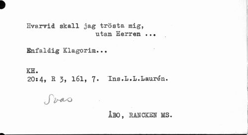 //// W i //// Hvarvid skall jag trösta mig, //// utan Herren .. . //// Enfaldig Klagorim. • ? KH. //// 20:4, R 3, 161, 7» Ins.L.L.Laurén* //// [ //// ÅBO, BMCKEN MS. //// i ////