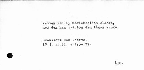 //// I //// a //// Vatten kan ej kärlekselden släcka, nej den kan tvärtom den lågan väcka, //// i . .. ... r> //// Svenssons saml.häfte, //// 10:4* nr.31, s.175-177* //// ÅBO. ////
