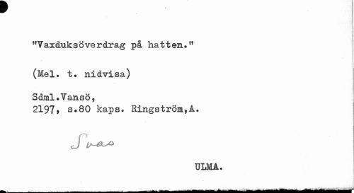 //// ¥ //// "Vaxduksöverdrag på hatten." //// (Mel. t. nidvisa) Sdml.Vansö, //// 2197» s.80 kaps. Ringström,!. //// J //// U LMA. //// ¦ ////