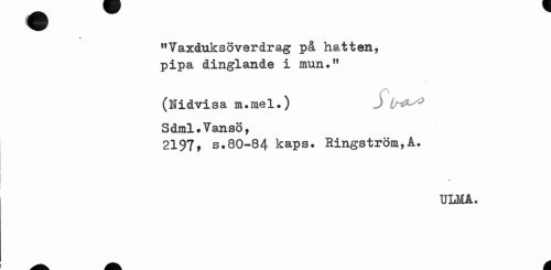 //// * //// "Vaxduksöverdrag på hatten, pipa dinglande i mun." //// (Nidvisa m.mel.) J //// Sdml#Vansö, //// 2197, s.80-84 kaps. Ringström,A. //// ULMA. ////