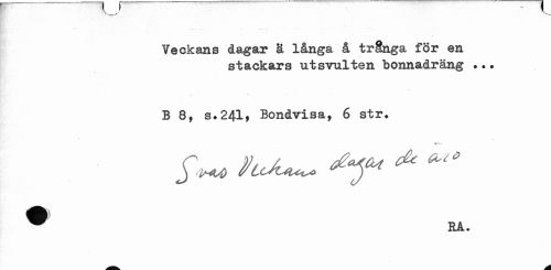 //// V___y //// Veckans dagar ä långa å trånga för en //// stackars utsvulten bonnadräng ... //// B 8, s.241, Bondvisa, 6 str. //// RA. ////