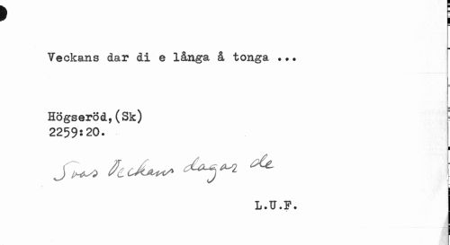 //// f //// Veckans dar di e långa å tonga ... //// Högseröd,(Sk) ! //// 2259«20. //// I //// r //// L.U.F. ////