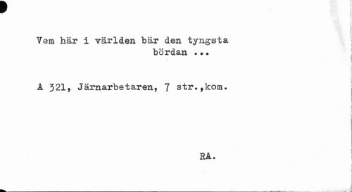 //// v //// \ //// Tern här i världen bär den tyngsta //// bördan . •• //// A 321, Järnarbetaren, 7 str.,kom. //// t //// * //// 1 //// RÅ. //// j //// ¦ ////