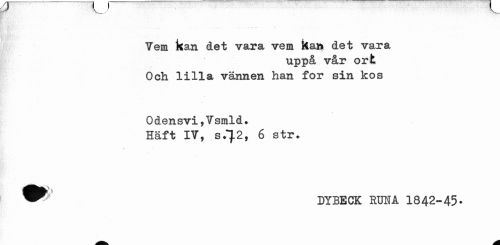 //// ff X__y //// Vem kan det vara vem kan det vara //// uppå vår ort Och lilla vännen han for sin kos //// Odensvi,Vsmld# Häft IV, s.^2, 6 str. //// / //// DYBECK mm A 1842-45- ////