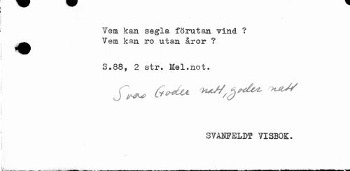 //// Vem kan segla förutan vind ? ^^ Vem kan ro utan åror ? //// S.88, 2 str. Mel.not. //// SVÅHFELDt VISBOK. //// . __ . _. _ _ . . . _ .- - _ ^ _ ////