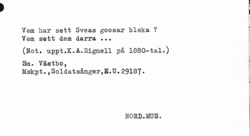 //// ' i //// Vem har sett Sveas gossar bleka ? Vem sett dem darra ... //// (Not* uppt.K.A.Rignell på 1880-tal.) Sm. Västbo, //// Mskpt.,Soldatsånger,E.U.29187. //// i //// ? //// HORD.MUS. ////