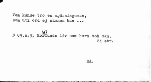 //// I //// Vem kunde tro en ogärningsman, som uti ord ej nämnas kan •. • //// B 89 , s»3, Morlunds liv som barn och man. i //// 24 str. //// 1 //// RA. //// j l //// ... ... ////