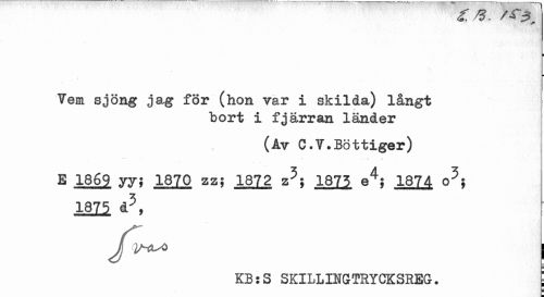 //// i ¦ //// Vem sjöng jag för (hon var i skilda) långt //// bort i fjärran länder //// (Av C.V.Bottiger) //// B 1869 yy; 1870 zz; 1872 z5; 1875 e4; 1874 o3; 1875 d5, //// fv+A j //// KBsS SKILLINGTRYCKSREG. j ////