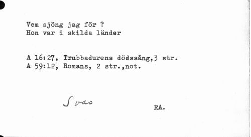 //// 7em sjöng jag för ? Hon var i skilda länder //// A 16:27, Trubbadurens dödssång,3 str» A 59*12, Romans, 2 str»,not» //// RA. //// _ //// - l ////