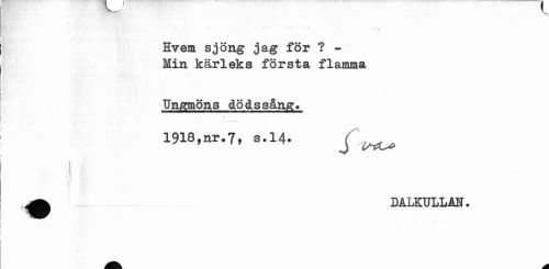 //// Hvem sjöng jag för ? -Min kärleks första flamma //// Ungmöns dödssång» //// « //// 1918,ar.7, s.14. j ^^ //// 1 //// A DALKULLAN. ////
