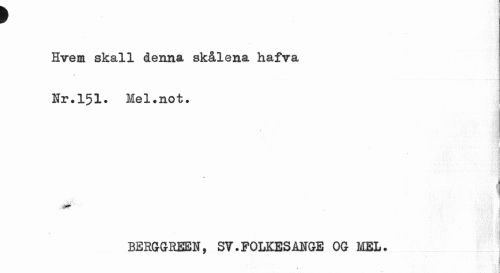 //// f //// Hvem skall denna skålena hafva //// r //// 1 //// Hr.151» Mel»not. //// < //// ¦ , i //// BERGGBEEN, SV.FOLKESANGE OG MEL. //// i ////