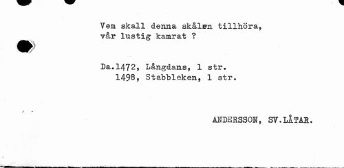 //// Vem skall denna skålen tillhöra, vår lustig kamrat ? //// Da. 1472, Långdans, 1 str. //// 1498? Stabbleken, 1 str. //// / //// ANDERSSON, SV.LÅTAR. //// i ////