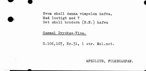 //// Hvem skall denna vimpelen hafva, ^^ Med lustigt mod ? //// ^^ Det skall brodern (N.N.) hafva //// Gammal Dr.yckes~Yisa. //// S.106,107, Nr.31, 1 str. Mel.not. //// AFZELIUS, FOLKSHAHPM • ////