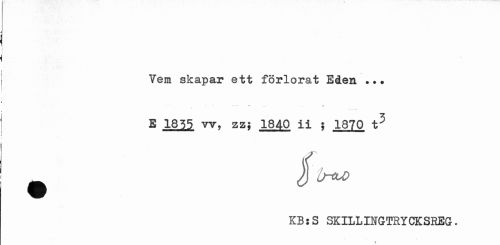 //// Vem skapar ett förlorat Sden //// > w . . « //// E 1855 w, zz$ 1840 ii i 1870 t^ //// jf b-M //// KBjS skillingtrycksreg. //// i. ////