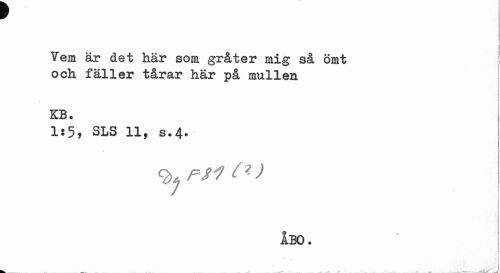 //// f //// Vem är det här som gråter mig så ömt och fäller tårar här på mullen //// KB. //// Is5, SLS 11, s.4. //// ÅBO. ////