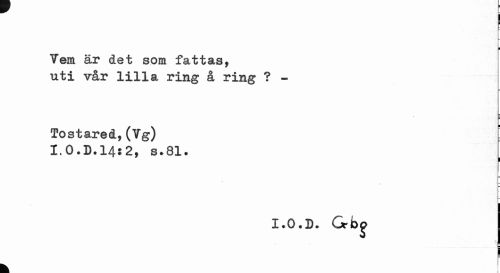//// i //// L I //// Vem är det som fattas, //// uti vår lilla ring å ring ? - //// ¦ //// Tostared,(Vg) I.0.D.14:2, s.81. //// 1= r //// r //// I.O.D. Gi>£ j ////