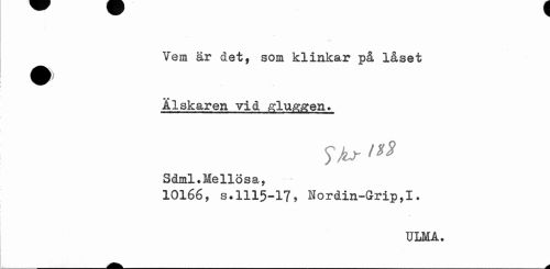 //// Vem är det, som klinkar på låset Ålskaren vid gluggen» //// Skr /** //// Sdml.Mellösa, //// 10166, s.1115-17, Nordin-Grip,I. //// ULMA» ////