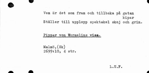 //// Vem är det som fram och tillbaka på gatan //// kipar //// Ställer till upplopp spektakel skoj och grin. //// Pippar von fflormelins visa. //// Malmö,(Sk) 2699*10, 4 str. //// L.U.F. //// a, A 4 ////