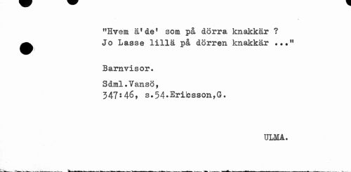 //// * //// f,Hvem äfdef som på dörra knakkär ? //// • Jo Lasse lilla på dörren knakkär . • •11 //// i //// Barnvisor. Sdml.Vansö, //// 347:46, s.54*Eribsson,G. //// ULMA. ////