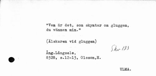 //// !,Vem är det, som skymtar om gluggen, du vännen min.w //// (Älskaren vid gluggen) //// Ång.Långsele, ^ 8328, s.12-13, Olsson,H. //// ULMA. ////