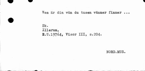 //// Vem är din vän du tusen vänner finner ..* Sk. //// Ällerum, //// E.U.19764, Visor III, s.204. //// NORD.MUS. ////