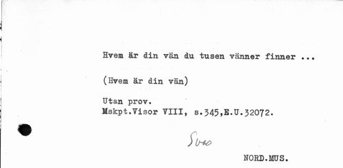 //// • ___ //// Hvem är din vän du tusen vänner finner ?•. //// (Hvem är din vän) Utan prov. //// Mskpt.Visor VIII, s.345,E.U.32072. //// HORD. MS. ////