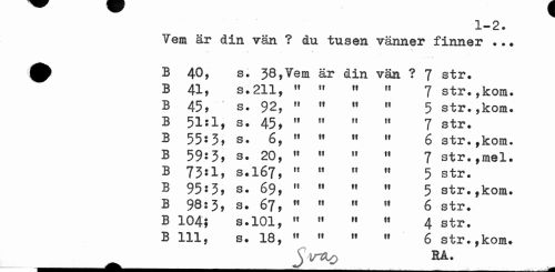 //// 1-2. //// Tern är din vän ? du tusen vänner finner ... //// ^^ B 40, s. 38,Yem är din vän ? 7 str. //// B 41» s.211, " 11 ft ft 7 str.,kom. //// B 45, s. 92, 11 tf 11 ft 5 str.,kom. //// B 51J1, s. 45, 11 " ft w 7 str. //// B 55*3? s. 6, " w M w 6 str.,konu //// B 59*3, s. 20, 11 11 " 11 7 str.,mel. //// B 73*1, s.167, 11 " rf » 5 str. //// B 95»3, s. 69, " " M ,f 5 str.,kom. //// B 98:3, s. 67, f1 11 M " 6 str. //// B 104? s.101, H w M w 4 str. //// B 111, s. 18, w " rt ff 6 str.,kom. //// ^ RÅ. ////