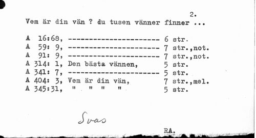 //// 2. //// Vem är din vän ? du tusen vänner finner .•. //// A 16:68, --- 6 str* i //// * i //// A 59$ 9, ——---7 str.,not, //// A 91: 9,---7 str.,not. //// A 314* 1> Den bästa vännen, 5 str. //// A 34I: 7, ---5 str. //// A 404: 3* Vem är din vän, 7 str.,mel. //// A 345:31, « » » « 5 str. 1 //// S IH^O //// RA. , //// ^ji^BrfÉUMÉK.. — ***** _ MiLMmLL , Ahém^M^MMM^^B ////