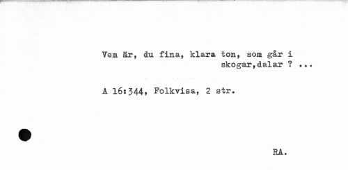 //// Vem är, du fina, klara ton, som går i //// skogar,dalar ? ... //// A 16:344, Folkvisa, 2 str. //// Rå. ////
