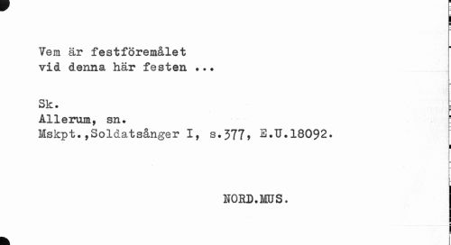 //// j //// i //// Vem är festföremålet ^ //// vid denna här festen ... //// = r //// Sk. //// Allerum, sn. ! //// Mskpt.,Soldatsånger I, s.377, E.U.18092. //// 1 //// f h //// HORD.MOS. //// ¦ //// | //// It ////