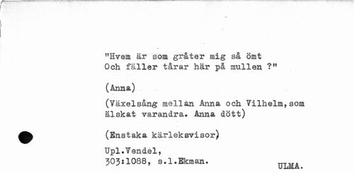 //// é //// "Hvem är som gråter mig så ömt Och fäller tårar här på mullen ?ft //// (Anna) //// (Växelsång mellan Anna och Vilhelm,som älskat varandra. Anna dött) //// ^^ (Enstaka kärleksvisor) //// Upl.Vendel, //// 303:1088, s.l.Ekman. ULMA ////