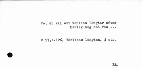//// Vet du väl att världen längtar efter //// kärlek hög och ren //// B 97,s.126, Världens längtan, 4 str. //// RA. ////