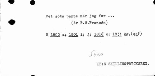 //// Yet söta pappa när jag for ... //// (Av F.M.Fransen) //// ¦a ' ¦ //// E 1800 a; 1801 i; j; 1816: c; 1854 g«,(qq?) //// J //// KBsS SKILLIIfGTRYCKSREG. ////