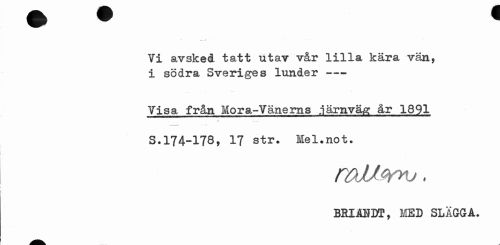 //// Vi avsked tatt utav vår lilla kära vän, i södra Sveriges lunder --- //// Visa från Mora-Vänerns .järnväg år 1891 S.174-178, 17 str. Mel.not. //// roJUmv, //// BRIABDT, MED SLÄGGA. ////