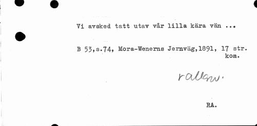 //// — ^ //// Vi avsked tatt utav vår lilla kära vän . //// B 53,s.74, Mora-Wenerns Jernväg,1891> 17 str. //// kom. //// % //// RA. ////