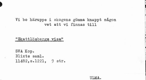 //// » i //// ¦ //// Ti bo häruppe i skogens gömma knappt någon //// vet att vi finnas till //// i //// "Skattlösbergs visa11 //// i //// STA Kop. //// _ //// Blixts saml. //// 11482,s.1221, 9 str. //// ULMA. ! ////