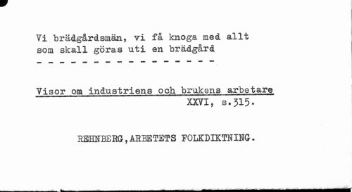 //// j //// Ti brädgårdsmän, vi få knoga med allt //// som skall göras uti en brädgård //// ¦ //// Yisor om industriens och brukens arbetare //// xxvi, s.315. //// REHNBERG, ARBETETS FOLKDIKTNING. ////
