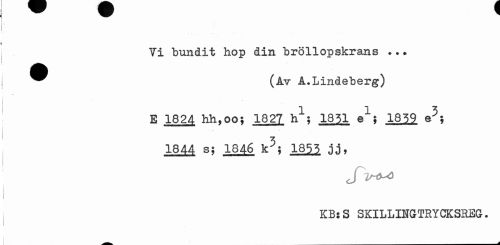 //// Vi bundit hop din bröllopskrans ... ^^ (Av A.Lindeberg) //// E 1824 hh,oo; 1827 h1? 1831 e1; 1839 e5; 1844 s; 1846 k3; 1853 jj, //// ICB: S SKILLIHGTRYCKSREG. ////